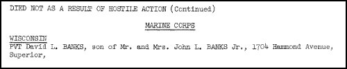 ![]() On 16 April 1969 Private David L. Banks, serving with H&S Company, 1st Battalion, 7th Marines was wounded by an accidental discharge while standing a bridge watch at Dai Loc, southwest of Danang. He was evacuated to the hospital ship USS SANCTUARY where he died on 21 April 1969. John and David Banks are buried with their mother in the Greenwood Cemetery, Superior, Wisconsin. |