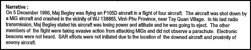 ![]() Since there was no proof that Major Begley had been killed he was carried as Missing in Action, and promoted while in that status, until the Secretary of the Air Force approved a Presumptive Finding of Death on 04 Apr 1978. Colonel Begley's remains actually had been repatriated in 1986 but could not be identified at the time. The 14 Feb 94 report cited above noted that remains 110-86 were undergoing analysis when the report was being written; they were positively identified on 18 April 1986. |