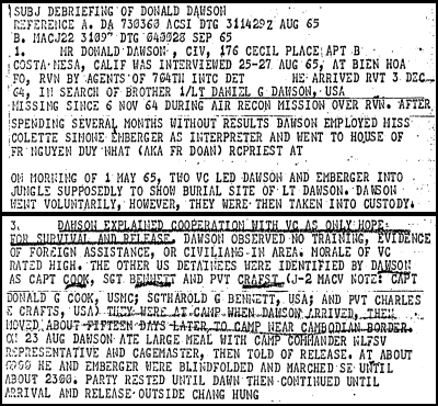 ![]() Mr. Dawson notes that the three military POWs, including SSG Bennett, were moved "about 15 days" after Dawson arrived in the detention camp. Another POW, SFC Isaac Camacho, B Co, 5th SF Group, captured 24 Nov 1963 and escaped 13 Jul 1965, reported that the three men arrived in the camp where he was being held on or about 28 May 1965. As noted above Radio Hanoi announced SSG Bennett's execution on 24 June 1965. While Mr. Dawson could not and did not claim to have witnessed the execution, the Life Magazine article no doubt included mention of the POWs Mr. Dawson encountered - and the execution of one of those POWs. Life probably also mentioned PFC Crafts' release, but could not in 1971-72 have known what happened to Captain Cook. |