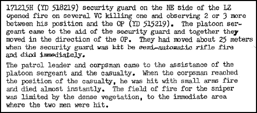 ![]() The report goes on to describe the actions taken to recover the bodies of the two men and to defend themselves against further attacks by the VC force. The patrol was successfully extracted at 0640, 18 May. The security guard was Cpl Randy G. Totten of Reed City, Michigan; the Corpsman was HN Loring W. Carper. Both men were assigned to 1st Force Recon Company.