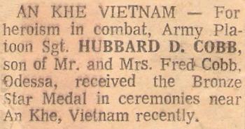27 Jul 2006 After researching Don for the past few years, his cousin, Ray Strange of Odessa gave me a copy of this picture which we restored. H. Don was born in Athens, Texas and grew up in the oilfields of East Texas, West Texas and Eastern New Mexico. He was an only child, entered the Army at age 17 from Odessa, Texas when he became disillusioned with school. He served in Korea and Germany. He was married and divorced and the father of a son Gary Don. He had completed a tour in Vietnam with the 5th Cav and had extended his tour, came home on leave. He had been awarded a Bronze Star for Valor and an Army Commendation Medal for meritorious service during his year long tour. His parents were living in Hobbs, New Mexico at the time. He had bought a little sports car when he was in Germany and he toured the country in it while on leave. He returned to Vietnam and was killed. He was buried with full military honors in the Athens City Cemetery, Athens, Texas. He had deep family roots there. His mother died in 1979 at age 55 and his father remarried and he was killed in a farm tractor accident in 1984 in Quitman, Texas at age 69. Both parents are buried next to Don in Athens. Don is remembered by the Permian Basin Vietnam Veterans' Memorial and efforts are being made to honor H. Don Cobb and Grover Lee Dickson, USMC, who received the Navy Cross in Vietnam, in Athens, Texas. Grover Lee is buried at the New Hope Cemetery in Athens and had roots there as well. Many thanks to Don's cousin, Ray Strange of Odessa, and Fran Adair Bethea of the Henderson County, Texas Geneological Society for their help in honoring Don.