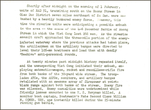 A Note from The Virtual WallThe US Naval Forces Vietnam History for Feb 1968 contains the following entry: