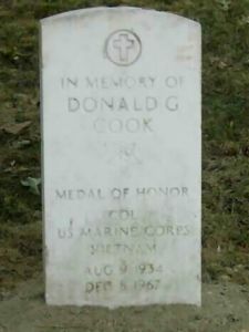 Donald Cook was the first Marine captured in Vietnam, and the first and only Marine to ever earn the Medal of Honor in captivity. The USS DONALD COOK (DDG-75) was named in his honor. The ship's motto epitomizes Cook's life: "Faith Without Fear". Cook was captured on December 31, 1964, while serving as an observer with the Fourth Battalion (Killer Sharks) of Vietnamese Marines at the Battle of Binh Gia. The Viet Cong held Cook in a series of primitive jungle POW camps. For nearly three years, Cook led ten fellow POWs in captivity, always looking out for their health and welfare, while complying with the spirit and intent of the Code of Conduct. He reportedly died on December 8, 1967, on a forced march to a new camp. Cook was declared officially dead in February 1980. His remains have never been recovered. His wife and four children survived him, as well as seven of his former POW comrades. For more information about Cook, go to the USS COOK's website and click on the lower right box entitled History Behind the Name.