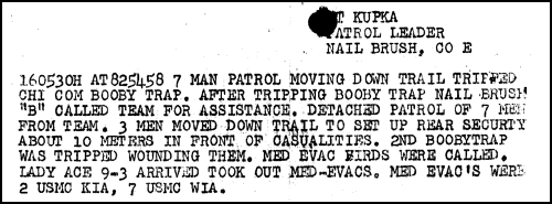 ![]() The 1st Recon Bn SITREP for 16 April reports that one of the wounded died during or immediately after evacuation, changing the toll to 3 dead, 6 wounded. The three Marines killed by the boobytraps were
