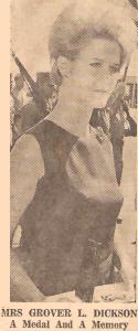 Among them was a slender, blonde woman, Mrs. Grover L. Dickson, 1115 South Randall in Pasadena. She accepted the Navy Cross, second highest honor awarded by the Marine Corps, for her husband, who died last Nov 11 as he charged an enemy bunker for the second time. The Navy Cross was the highest award presented at the ceremony.
