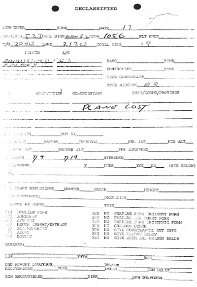 A Note from The Virtual WallThe Marine Air Group 12 Command Chronology for March 1969 contains the following entry:"Captain Charles E. FINNEY 094692/7583 USMC and 1/Lt Steven R. ARMITSTEAD 094095/7511 USMCR both members of VMA(AW)-533 were declared missing in action when their A6A aircraft struck ground and exploded during night bombing mission." ![]() Debrief sheet for Armitstead/Finney Mission 1056, 17 March 1969 From the VMA(AW)-533 Command Chronology |