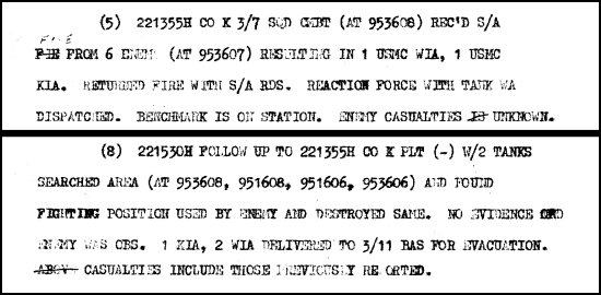 A Note from The Virtual WallThe 7th Marines' Situation Report for 22 Feb 1968 contains the following two entries:![]() Pfc Gregory Fischer was killed in this enaggement. |