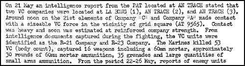 A Note from The Virtual WallOn 21 May 1966 units of the 1st Battalion, 9th Marines, were operating near An Trach, southwest of Danang, when they came under fire from a hamlet. The ensuing engagement is described in the 1/9 Marines' Command Chronology for the month: