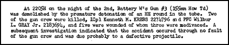 Whiskey Battery was at Gia Le, outside of Hue City. PFC Gray was a gunner on Gun 3 of the 155mm battery. There was a high explosive round in the tube and it blew up while still in the gun. LCPL Krebs was also killed and five other Marines were wounded. I was at Headquarters Battery at the time and heard about the incident. I did not know the men on the gun even though I was with Whiskey Battery for a couple of weeks ealier. I wanted him to be remembered.