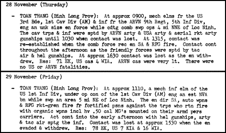 Specialist Harris was the RTO for the Alpha Company Commander, Captain Kenneth Bowen. Alpha and Charlie companies engaged the enemy at approximately 1100 hours on 29 Nov. Alpha's APCs were on the left with Charlie Co's APCs on the right. According to Captain Bowen it was a "hellatious day" against an enemy that was in bunkers and fox holes. The NVA poured small arms fire, automatic weapon fire, and rocket-propelled grenades from their fortified positions against the advancing troopers. Captain Bowen said air strikes and heavy artillery fire was called in to dislodge the NVA regulars. The fighting, which lasted some four and a half hours for the dismounted infantry, became intermingled, and close in, between the opposing forces as the NVA reportedly tried to flank the Americans numerous times. In the end the American forces, with the ARVNs assigned rear security, prevailed and the NVA evaded and withdrew, presumably into Cambodia.