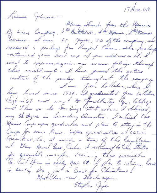 I was a Girl Scout in 1968. Our troop, under my mother's leadership, sent care packages to the soldiers in Viet Nam. My package went to Lt Stephan Joyner, I didn't know how lucky I was that it went to him. He sent me the kindest thank you note I have ever received. He told me about himself and about his plans. We found out he had been killed a few weeks after I received the letter. It broke my heart and had a profound effect on me. I still have the letter and often wonder what would have become of him. He was really a good man.