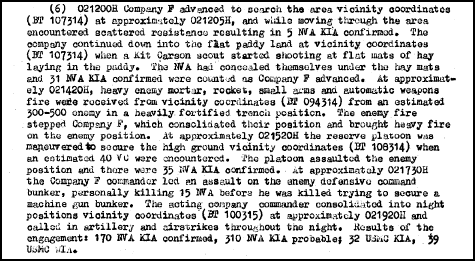 A Note from The Virtual WallThe 2nd Bn, 5th Marines' After-Action Report for Operation UNION II contains the following entry addressing a bitter fight at Vinh Huy, about 8 kilometers east-southeast of Que Son, on the afternoon of 02 June 1967:![]() The 32 men from 2/5 who died in this fight were