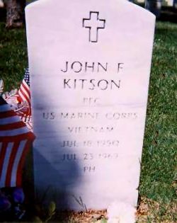 A Note from The Virtual WallThe 1/1 Marines' Command Chronology for July 1969 says that Charlie Company Marines detonated two booby traps shortly before noon on 23 July, one at 11:40 and one at 11:50. The two devices wounded a total of seven Marines - and two of them died from their injuries. The two men were Pfc Philip Hammons of Covington, Kentucky, and Pfc John F. Kitson, Levittown, New York.![]() ![]() Pfc John Francis Kitson, United States Marine Corps, is buried in Grave 2986, Section F, Long Island National Cemetery, Farmingdale, New York.