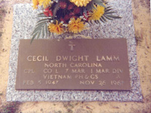 L CO, 3RD BN, 7TH MARINES, 1ST MARDIV, III MAF United States Marine Corps Lucama, North Carolina February 05, 1947 to November 26, 1967 CECIL D LAMM is on the Wall at Panel 30E, Line 92 |