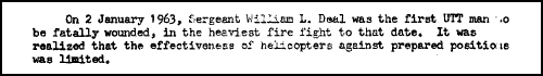 ![]() Sergeant William L. Deal was killed in action in UH-1B tail number 62-01882 while flying in support of ARVN forces at Ap Bac - but he wasn't the UTT's first loss. Sergeant Lee was. Further, the UTT's last two losses are missing from the dedication list. Available documentation indicates the UTT's eleven losses between 13 Nov 1962 and 12 Aug 1964 were: