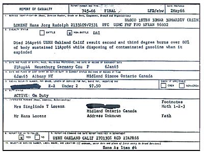At 1900H, Pfc Lorenz and another Marine, at Dong Den mountain in Quang Nam Province, attempted to dispose of some contaminated fuel by rolling the drum down a hill. It exploded, with the back-draft of fire burning Lorenz over 80% of his body. The two men were evacuated to C Company, 1st Medical Bn for treatment. Pfc Lorenz was transferred to Clark Air Base in The Philippines on 18 Apr 66. His wounds were serious enough to be transferred again to Oakland Naval Hospital where he succumbed to his injuries and died on 26 Apr 66. During 1966, there was no requirement for the individual Services to report war-related deaths which occurred outside Vietnam as a war casualties, and Pfc Lorenz's name was missed when the Vietnam Memorial Wall was erected. It wasn't until 2001, with the encouragement of a Veterans Association in Canada, that Hans Lorenz's mother submitted his name and facts to Headquarters, US Marine Corps for approval to be added to the Wall. A return response was swift - he was DENIED as an addition. The official reason was that his death was due to a non-hostile cause, which did not fall within the existing rules and regulations of Wall additions at the time. After a further investigation into this denial, the USMC did agree that had his name been submitted to them prior to 1993, his name would have been routinely approved for addition.