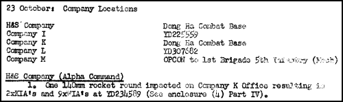 A Note from The Virtual WallThe 3rd Battalion, 4th Marines was withdrawn from Vietnam in October 1969. At the beginning of the month, the battalion was conducting combat operations around the Vandergrift Combat Base in western Quang Tri Province, but beginning on 08 Oct elements were relocated in sequence to the Dong Ha Combat Base and from there to Danang for embarkation in Navy shipping enroute Okinawa. On 23 Oct a command element and Kilo Company were at Dong Ha, India 3/4 was positioned 4 kilometers southhwest of the base, Lima 3/4 was working near the mouth of the Cua Viet River, and Mike 3/4 was conducting operations with the Army's 1st Brigade, 5th Infantry Division. The 3/4 Marines' Command Chronology contains the following entry for 23 Oct 1969: