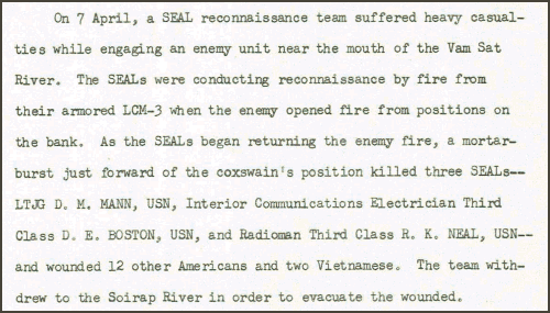 A Note from The Virtual WallTwo men from Seal Team ONE were killed in action on 07 Apr 1967 and a third died of wounds received in the action:
