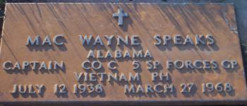 Captain Speaks was laid to rest in Hillview Memorial Park in Alexander City, Alabama, on 7 April 1968. Full military honors were rendered by personnel of the 20th SF Group (ABN). Captain Speaks' escort, WO1 Lucius Stanaland, stated that approximately 300 military personnel participated in the funeral service.