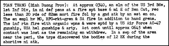 ![]() Although the Summary puts CANTIGNY east rather than west of Ben Cat, the remainder is accurate enough. The VC attack began with mortars and a ground attack followed. Five US soldiers were killed in the attack: