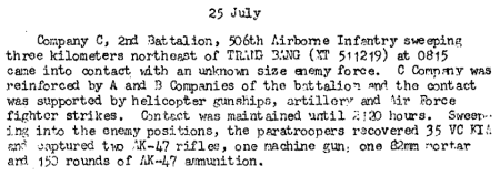 A Note from The Virtual WallAlthough most of the 101st Airborne Division was moved into the northern provinces in early 1968, elements of the division remained in the south, including the 2nd Bn, 506th Infantry which came under the operational command of the 25th Infantry Division. The following entry is taken from the 25th ID's Operational Report for the period May-July 1968: