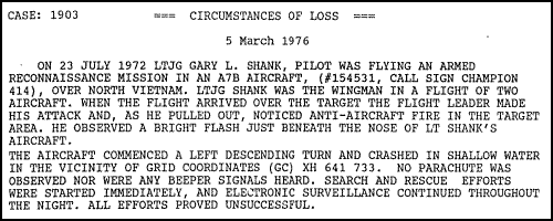 A Note from The Virtual WallThe Joint Task Force-Full Accounting report on LT Shank's loss contains the following information: