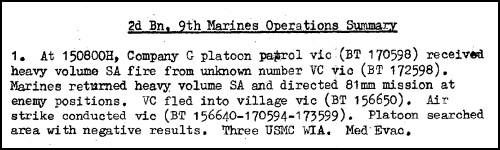 A Note from The Virtual WallThe 9th Marines' Situation Report for 15 June 1966 contains the following entry:
