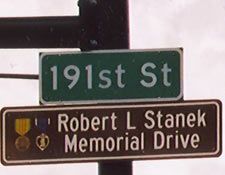 The co-naming of 191st Street in Mokena, Illinois, as "Robert L. Stanek Memorial Drive" is now a reality. Street signs have been installed and a formal dedication ceremony took place on Memorial Day, 2004. The dedication ceremony was a grand event. An estimated 500+ people, including many local government dignitaries, Stanek and Gurr family members, VFW, American Legion, US Marine Corps, Lincoln-Way Central High School Band, and numerous local and regional citizens attended the ceremony. The dedication master of ceremony was Mr. Vince DiFiore, Frankfort Township Trustee. Dedication speakers included Robert's brother Mr. James Stanek Jr.; Mayor of Mokena Mr. Robert Chiszar; Frankfort Township Supervisor Mr. James Moustis; Will County Executive Mr. Joseph Mikan; and Will County Sheriff Mr. Paul Kaupas. The VFW, American Legion and US Marine Corps provided color guards. A 21 Gun Salute, by the American Legion and Taps by the US Marine Corps also took place. Most honored participants were Robert's father, Mr. James Stanek Sr from Milan, Tennessee, and his widow Mrs. Judy Gurr from West Palm Beach, Florida. A dedication reception at a local banquet hall for dedication participants, dignitaries and family members followed the dedication ceremony. The entire event was a great success and truly memorialized and celebrated Robert L. Stanek's heroism and sacrifice, for freedom and the United States of America.