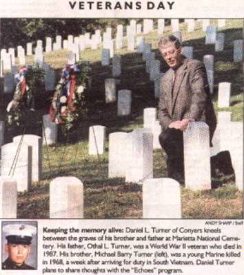 As the cold wind of time D.Turner For those of you that didn't know, my brother Mike was mortally wounded in battle 30 years ago this year. Since that time, my father maintained a constant count of Memorial Day adornments to all the grave sites in Marietta National Cemetery during our annual trip to my brother's grave to set out a wreath. It was always a humbling little venture to hear my old man gripe, bitch and swear about a lack of remembrance on this one time of the year that he upheld for the sake of his son. He never missed a year until his passing in 1987. Those of you that never met my old man would never guess where some of my "browbeating" habits derive. It's hard to find a way to describe how my dad had the foresight to "arrange" for his own burial as a Veteran of Guadalcanal, in a little triangular patch next to my brother's grave ... an area that I had thought to simply be a small space just at the end of the row of headstones. Obviously, my father had come to an "understanding" with the caretaker in 1968 transpiring something akin to an "act of God and Congress." In that regard, my annual sojourn and commemorative display has doubled with a pair of red, white & blue live wreaths that stand side by side below the belvedere in Marietta looking out over thousands of marble headstones with miniature flags. While I drive through the National Cemetery to the gravesites now, I too count personal commemorations, and just like my old man, I too ... gripe, bitch and swear. Yet, unlike my dad, I've learned to accept my generation to be considerably unlike his in certain matters. Some people will NOT go to Marietta National for the pain that it causes. Others will never go to Marietta National because they've never had to live through a KIA death. My mother, a BAM (Beautiful American Marine) in her own time, has never once been to The Wall or its mobile counterpart because I truly believe she refuses to allow herself the same agony I witnessed when I answered the doorbell one bright Saturday morning to our pastor and a Marine in uniform 30 years ago. I s'pose it's all relative to families dying away and moving far from these honored grounds. It's human nature to steer clear of the obvious dangers to morale and life, feelings and spirit. It's a lot easier to keep out of harm's way and cleanly avoid the day to day terrors surrounding each of us. Unless, you're 19 and right off the plane; thrown into the mill with thousands of Marines that had no idea what the Tet Offensive would ever mean. Advancing on a city with a deceptively pastoral little name like Hue that became the purgatory styled basis for the Stanley Kubrick movie, "Full Metal Jacket". It's only become apparent years after the fact that most of the new blood dropped into Viet Nam during that period found themselves embroiled in something not quite expected and only within days or hours of their arrival. To die in Viet Nam was jested with a "No Experience Necessary" sign posted upon your arrival. "It's a shame that such a young man has died" were the words spoken at several eulogies during the 40 days it took to bring my brother home. Actually, it truly wasn't a shame because Mike died fulfilling some directive ... that only Mike could ever know. It was his fate to die there, surrounded by strangers and just maybe ... hopefully ... a few pals with a wound that should not have allowed him to suffer... hopefully my brother did not suffer. This ... I'll never know. Mike had the opportunities. Mike could have stayed away. Steered clear of the obvious dangers to morale and life, feelings and spirit. Stayed out of harm's way while avoiding the carnage of the Battle of Hue City. Now THAT would have been human nature! Rather and instead, my brother took the point into the mawl and what Viet Nam gave back ... I honor each year. Mike chose to be in harm's way, and fate chose Mike with the cross hairs of sniper fire. He died as a 19 year old Marine, for all eternity in dress blues and white gloves; never marrying his high school love; never taking over my father's business and never there to sort out his siblings during the tumult of the 60's and 70's. His death rent some personal fabric that never seems to mend, but then again ... this is what makes Memorial Day that much more personal to me and countless others that have gone through the process of an immediate family KIA. The purpose of this missive is nothing more than a 3rd decade honoring that of my older brother keeping in mind the hundreds of thousands before and after him in "service to a grateful nation" .... those words being the offering from the OIC of each funeral in presenting the burial flag to the immediate family. One of the purposes of Memorial Day is NOT the unoffical first day of Summer, rather it's the purpose behind those final words ... "a grateful nation". For me, another rending period of reflection as I take two wreaths to the National Cemetery and see thousands of unadorned and forgotten graves from many battles and realize that one day, these two stones will likewise go without the personal commemorations they will always deserve. At that point, it's up to you. In the same fashion, it was up to Mike, too. In choosing not to steer clear or keeping out of harm's way. By bravely overcoming any fear within himself to go over and beyond that basic part of human nature and instinct while a ferocious battle surrounded him, my brother Mike found himself in common with these hundreds of thousands of men and women that likewise saw their hopes, ideals and dreams snuffed in a single fateful moment. If you can't think of any one thing in particular to raise a toast to on this holiday, think of one 19 year old Marine named Mike and in that salute you'll be honoring the memories of hundreds of thousands who went to war on our behalf ... with the same hopes, ideals and dreams that made my brother enlist in the service of his Country, his "grateful nation" and his Corps.