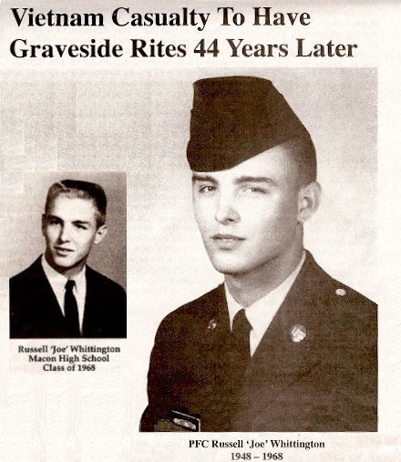 and it read: "Pfc Russel Joseph Whittington, 20, of Macon was killed in action while fighting in Vietnam Wednesday.