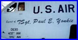 ![]() Almost thirty years to the day after his death the Airlift Wing at Charleston AFB, SC, dedicated a C-141 to Paul Yonkie. They call it "The Spirit of TSgt Paul E. Yonkie". His widow and daughters were in attendance.