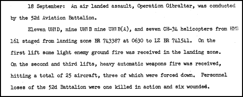 As noted in the 52nd Avn Bn History, GIBRALTAR was executed on 18 September. While 2/327th Infantry was lifted into place as expected in two locations 2 kilometers NE and NW of the village, the Commanding Officer of 2/502 made an in-flight decision to land just at the southern edge of An Ninh, thereby eliminating the 2 kilometer approach march for 2/502 and hopefully increasing the assault's shock value. As it turned out, the decision was a bad one - the helos carrying 2nd Bn, 502nd Infantry landed in the midst of the 95th NVA Bn's training ground. Even worse, the selected site was a set of small rice paddies surrounded on three side by hills, and the VC/NVA held the high ground.